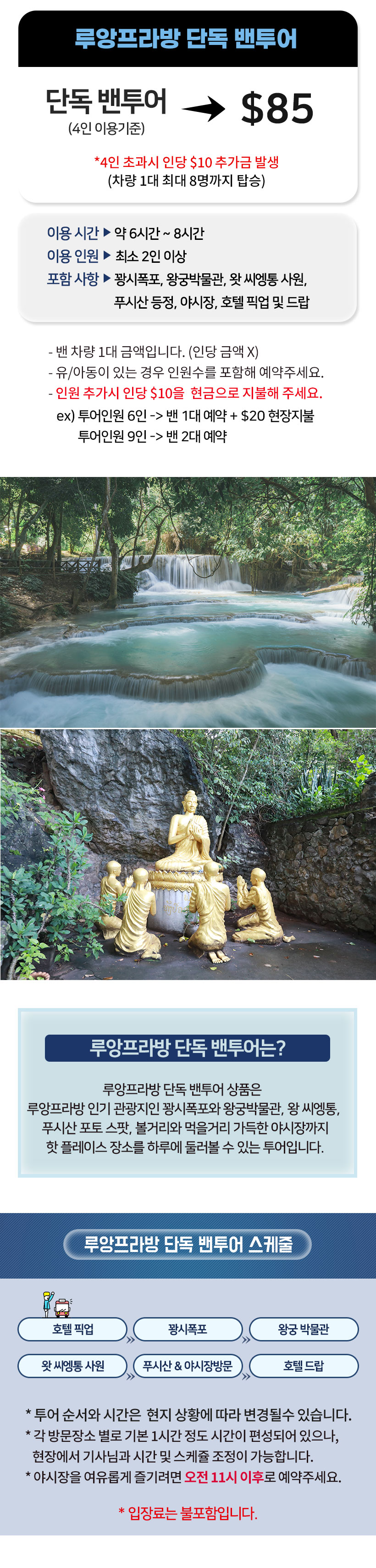 - 개별자유여행(선택관광) 중 발생하는 모든 사고 책임은 예약대행사인 라오스플레이에 전가할 수 없으며, 여행자 보험 가입을 추천합니다.