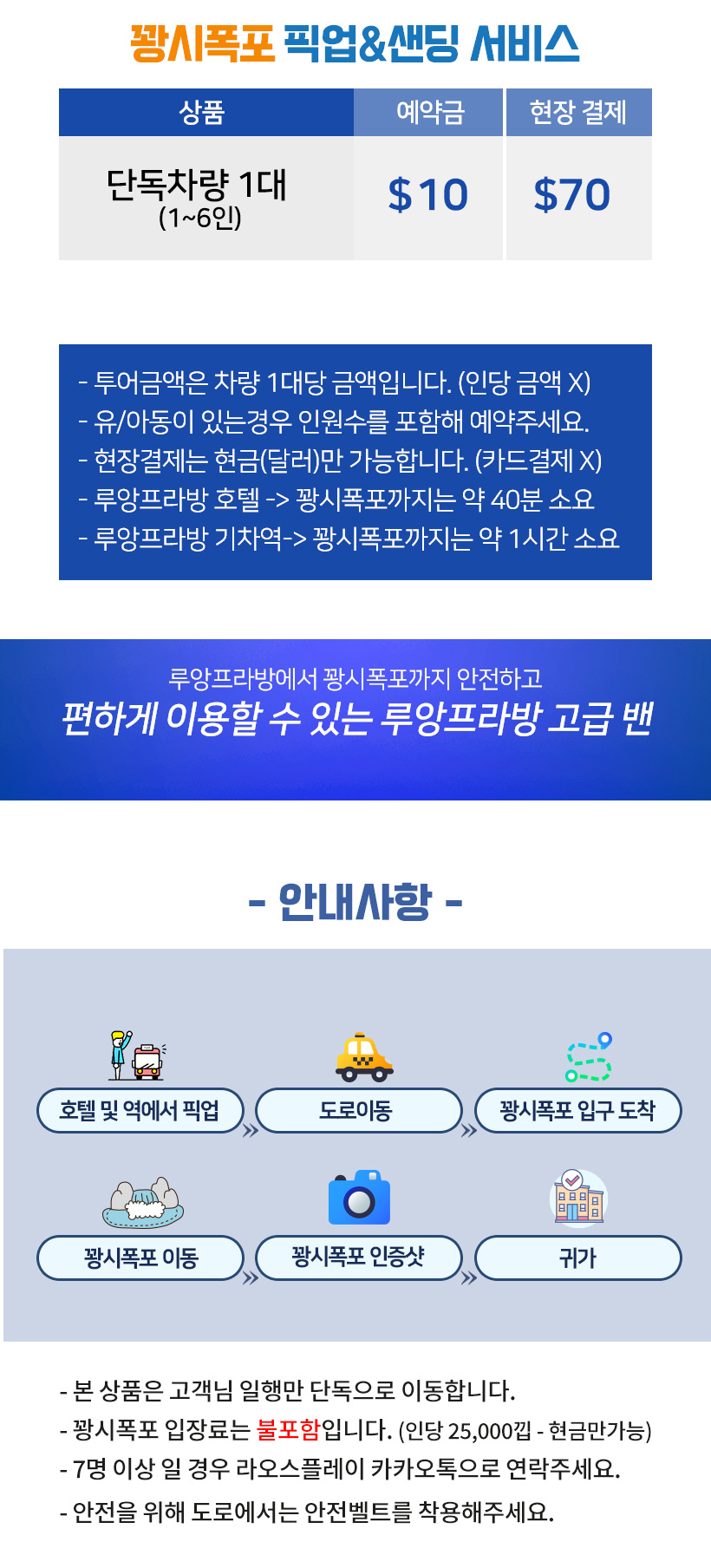 혼자 여행중인데, 마침 여행중에 만난 2명과 함께 3명으로 예약했어요. 설명에 있는 트럭이 올줄 알았는데 미니밴이 왔고 기사도 영어가 되는 성실한 분이었습니다. 꽝시폭포까지 신속하게 데려다주었고 가사님은 2시간을 제안했는데, 저희는 수영도 하고 꽝시 옆에 있는 무엉께오 폭포도 볼거라 더 길게 있겠다 했더니 2시간 반까지 기다려주겠다 했어요. 결론적으로는 2시간만에 다 끝나고 내려왔습니다ㅋ 2월의 폭포는 물이 꽤 차갑더라구요ㅎ 꽝시 이후에 다른 작은 오해가 생기는 일이 있었지만 기차역 픽업, 꽝시폭포, 호텔/기차역 드랍 자체는 만족스러웠습니다. 10달러는 미리 결재, 나머지는 현장 지불인데 기사님은 잔돈이 없을수 있으니 금액에 딱 맞춰서 달러를 준비하는걸 추천드려요