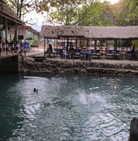 마지막 목적지인 블루라군에서는 에메랄드빛 맑은 물에서 수영하며 여행 피로를 씻어낼 수 있습니다. 뜨거운 동남아시아 날씨에 시원한 자연 수영장은 그야말로 천국과 같은 경험을 선사합니다.